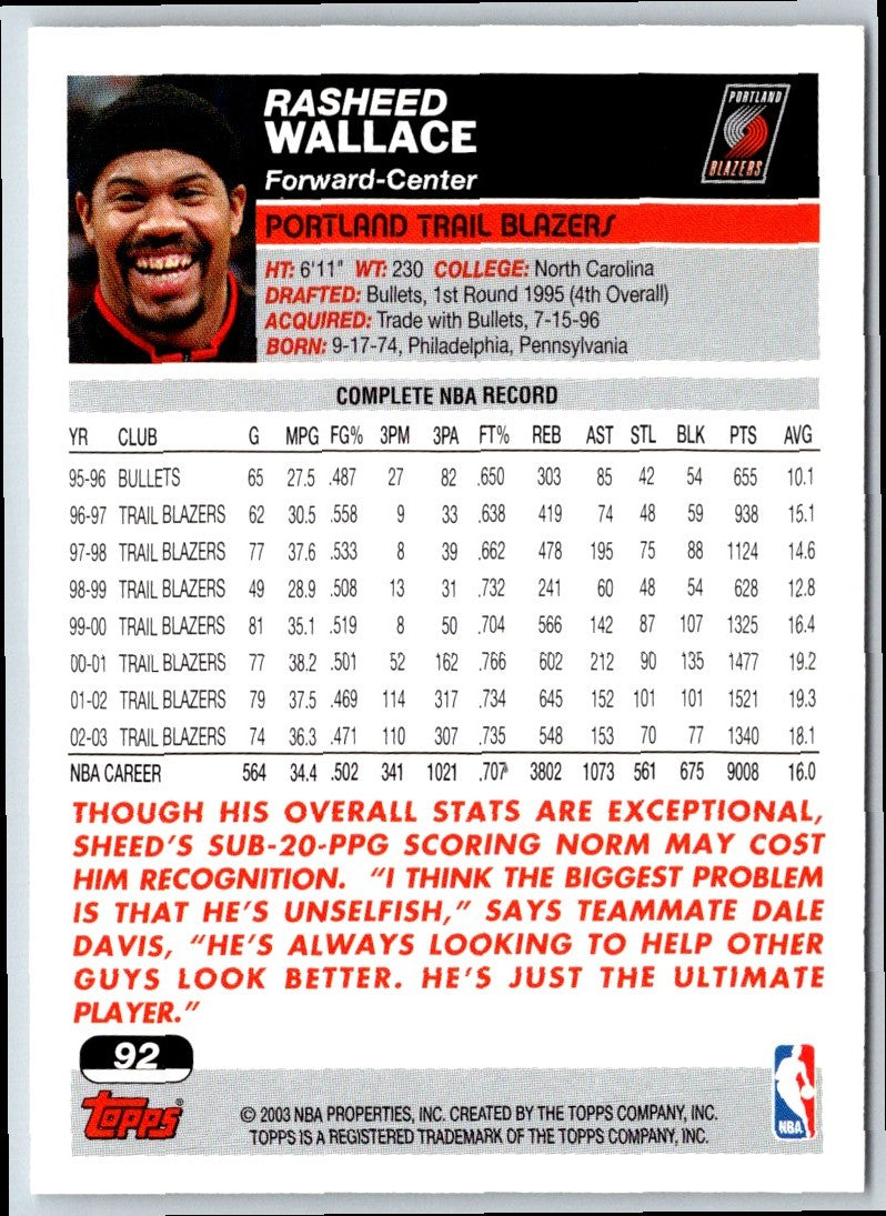 This 2003 Topps Collection Rasheed Wallace #92 Portland Trail Blazers card is the perfect addition to any sports memorabilia collection. Its unique design features a close-up image of Wallace in his Trail Blazers uniform, making for an eye-catching piece that any Blazers fan will love. The card is printed on high-quality paper and has a glossy finish that adds to its long-term appeal. The back of the card displays Wallace’s career highlights, further adding to its collectible value. Add this card to your collection and celebrate the glory days of this legendary player.