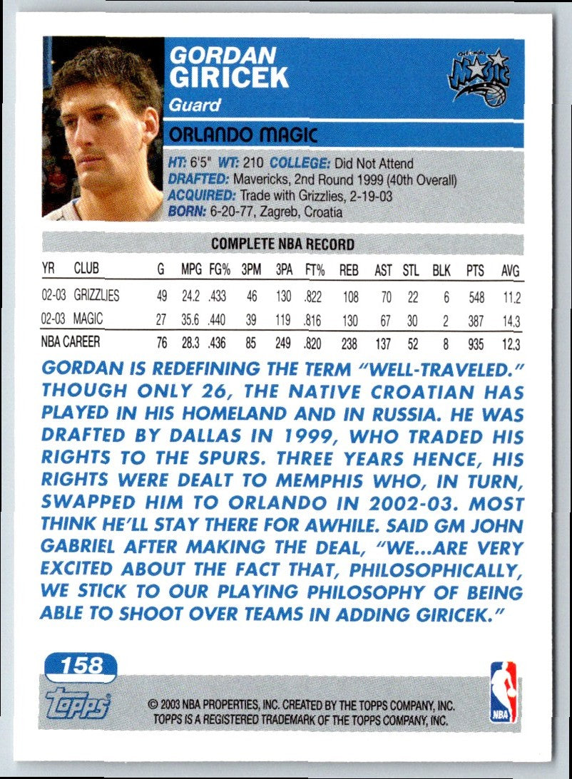 This 2003 Topps Gordon Giricek #158 card is the perfect addition to any Orlando Magic fan's collection! Featuring Giricek in his classic Magic jersey, this card is sure to be a hit with any collector. Show your support for the Magic and pick up this card today!