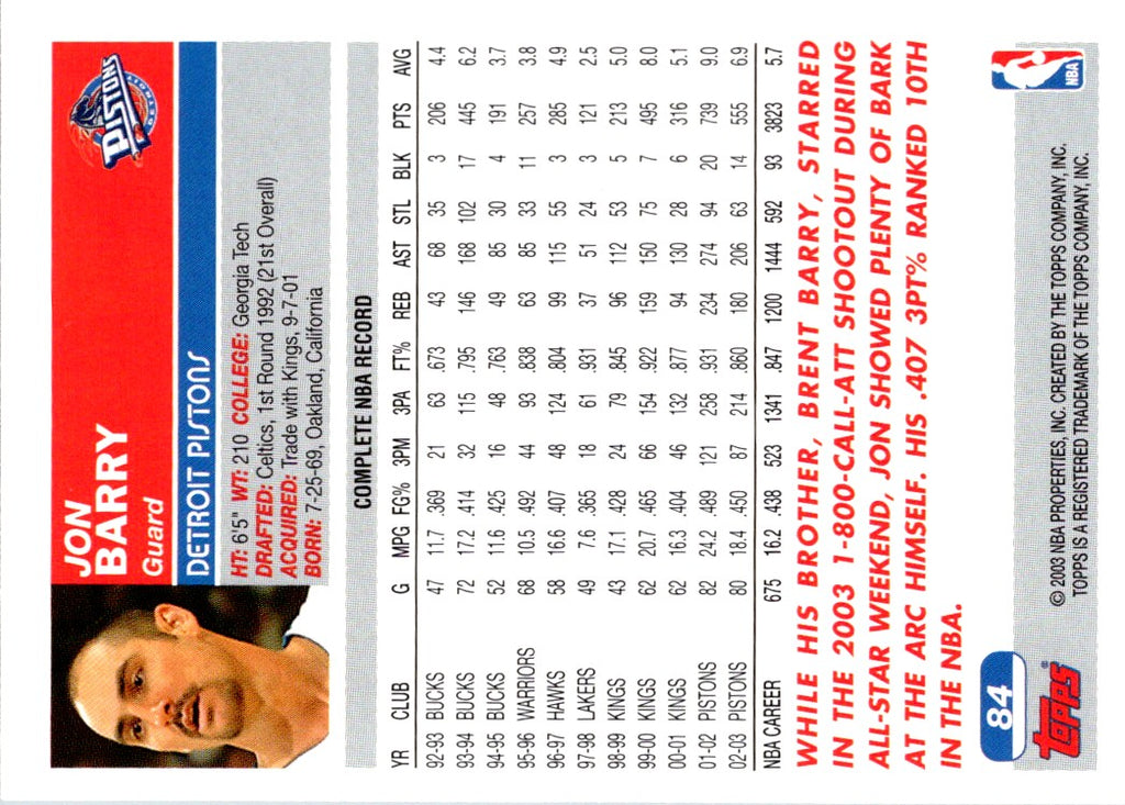 This 2003 Topps Jon Barry #84 card features a full-color action shot of the Detroit Pistons guard. It features a vibrant Topps design and is in mint condition. It's a great way to show your support for the Pistons and commemorate a great player's career. Collectors and fans of the Pistons will love owning this card and adding it to their collection.