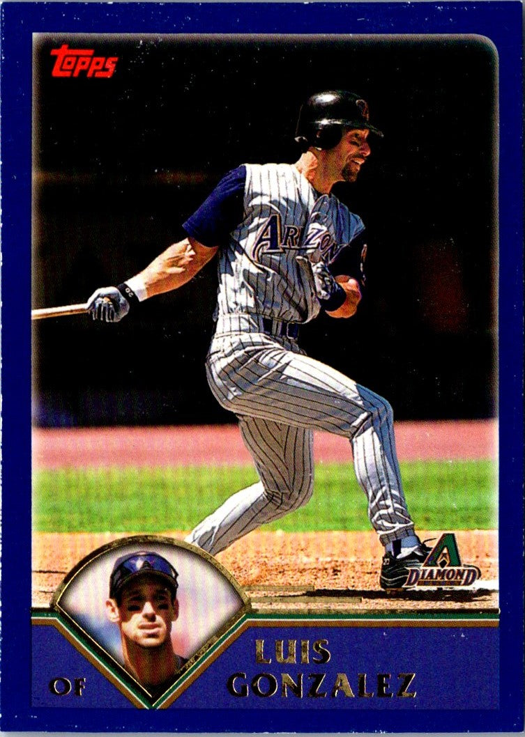 Introduce your collection to 2003 Topps Luis Gonzalez #73 Arizona Diamondbacks! This card celebrates a key figure in the Diamondbacks' 2001 World Series Championship. Featuring Gonzalez in his classic Diamondbacks road jersey, this card is sure to be a great addition to any collection. Gonzalez was a member of the 2001 All-Star team and finished in the top ten in the MVP voting two years in a row. This card is a must have for any Diamondbacks fan!