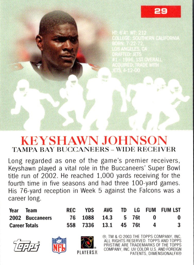 This 2003 Topps Pristine Keyshawn Johnson #29Tampa Bay Buccaneers card is a must-have item for any serious collector. Featuring vibrant colors and a glossy finish, this card is sure to add some serious value to any collection. With Johnson's action-packed image, this card is perfect for any fan of the Tampa Bay Buccaneers. Don't miss this opportunity to add this beautiful card to your collection!