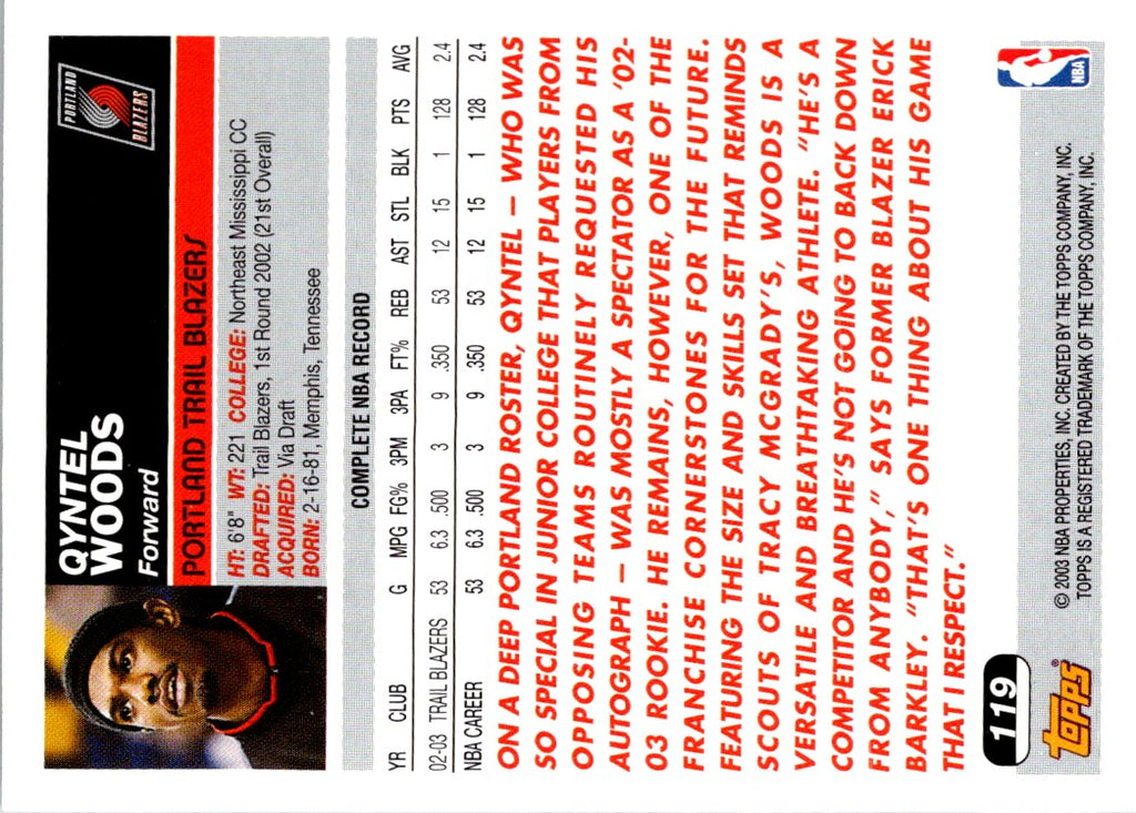 This 2003 Topps Qyntel Woods #119 Portland Trail Blazers card features a classic portrait of the basketball player that captures his intensity and athleticism. The card is printed on premium cardstock and features a detailed design with a glossy finish. This card is a must-have for all Portland Trail Blazers and Qyntel Woods fans. Add this card to your collection and show your support for the Blazers and Qyntel Woods.