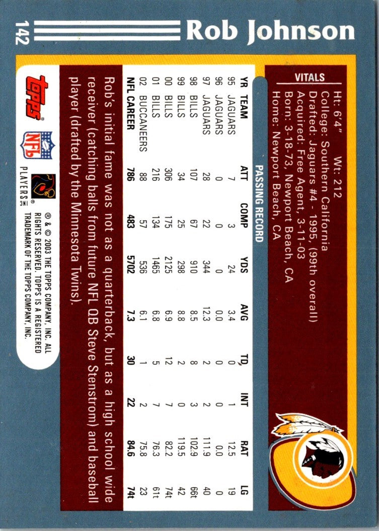 This 2003 Topps Rob Johnson #142 card is a must-have for Washington Redskins and NFL fans! The card features a full-color image of Johnson in his Redskins uniform, making it a great addition to any collection. It's in near-mint condition, so you know it will look sharp in a binder or frame. This card won't last long, so get it now!