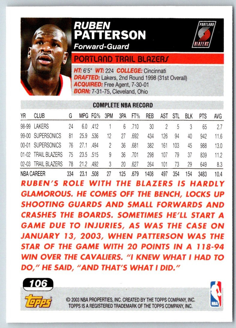 This 2003 Topps Ruben Patterson #106 card features the Portland Trail Blazers player in a blue and black uniform, with his name and number prominently displayed. This card is perfect for any Trail Blazers fan or any collector of basketball cards. The card is in Near Mint to Mint condition, and features Patterson on the court, in action. It's a great addition to any collection, and sure to delight any fan of the Trail Blazers.