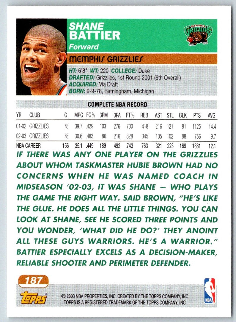 Shane Battier has been one of the NBA's most consistent players since he was drafted in 2001. This 2003 Topps card captures a moment in his career with the Memphis Grizzlies. The card features a full-color action photo of Shane in mid-air ready to dunk. The back of the card includes stats and information about Battier's career and his accomplishments while with the Grizzlies. Whether you're a fan of Shane Battier or the Grizzlies, this card is a must-have for any collection. Show your support for one of the all-time NBA greats with this 2003 Topps Shane Battier card.