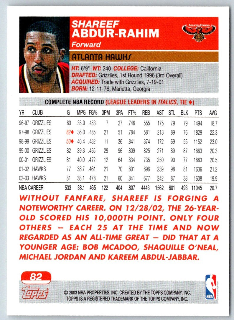 The 2003 Topps Shareef Abdur-Rahim card #82 celebrates the Atlanta Hawks star forward who was a two-time NBA All-Star and a member of the All-NBA Third Team in 2001. This card is in near-mint condition and features a full-color image of Shareef with the Hawks uniform. The back contains his career highlights, stats, and a short biography. This card is a must-have for any basketball collector or fan of the Atlanta Hawks. Get it now and add it to your collection!