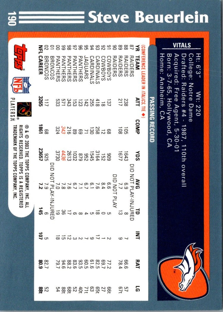 This 2003 Topps Steve Beuerlein #190 Denver Broncos card is the perfect addition to any NFL card collector's library. The image of Beuerlein in his blue and orange Broncos uniform captures a moment of intense concentration and focus, just like he was on the field. The card also features Beuerlein's detailed stats from the 2002-03 season, including his impressive passing yards and TDs. This card is a great way to commemorate the accomplishments of a Denver Broncos legend!