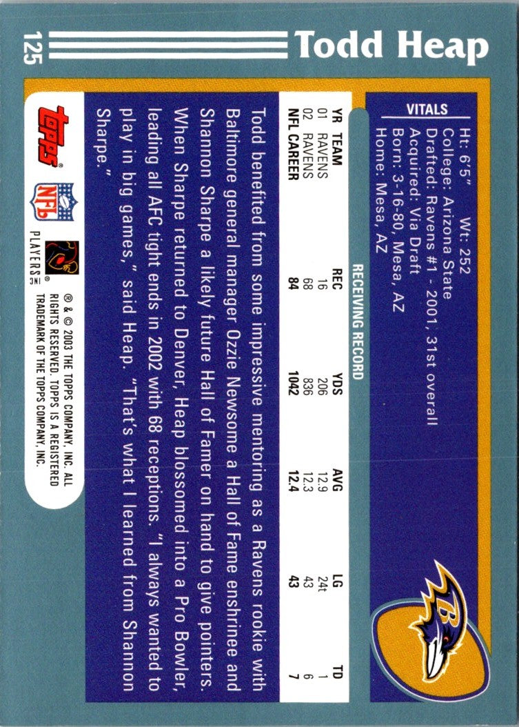 Introducing 2003 Topps Todd Heap #125 Baltimore Ravens! This iconic card features Todd Heap, the legendary Ravens tight end, in a dynamic pose ready to make a play. Show off your Ravens pride with this collectible card, a must-have for any Baltimore fan. This card is printed on high-quality cardboard, with vibrant colors and crisp details that make it perfect for adding to your collection. Add this card to your memorabilia today and honor a Ravens legend!