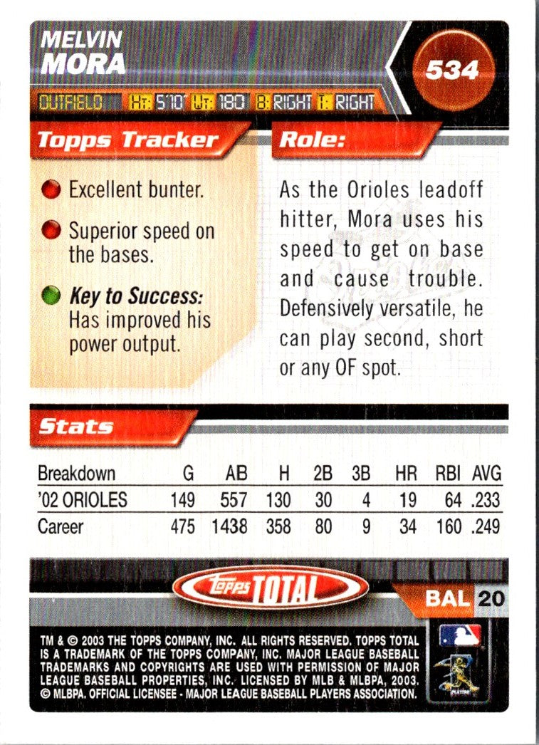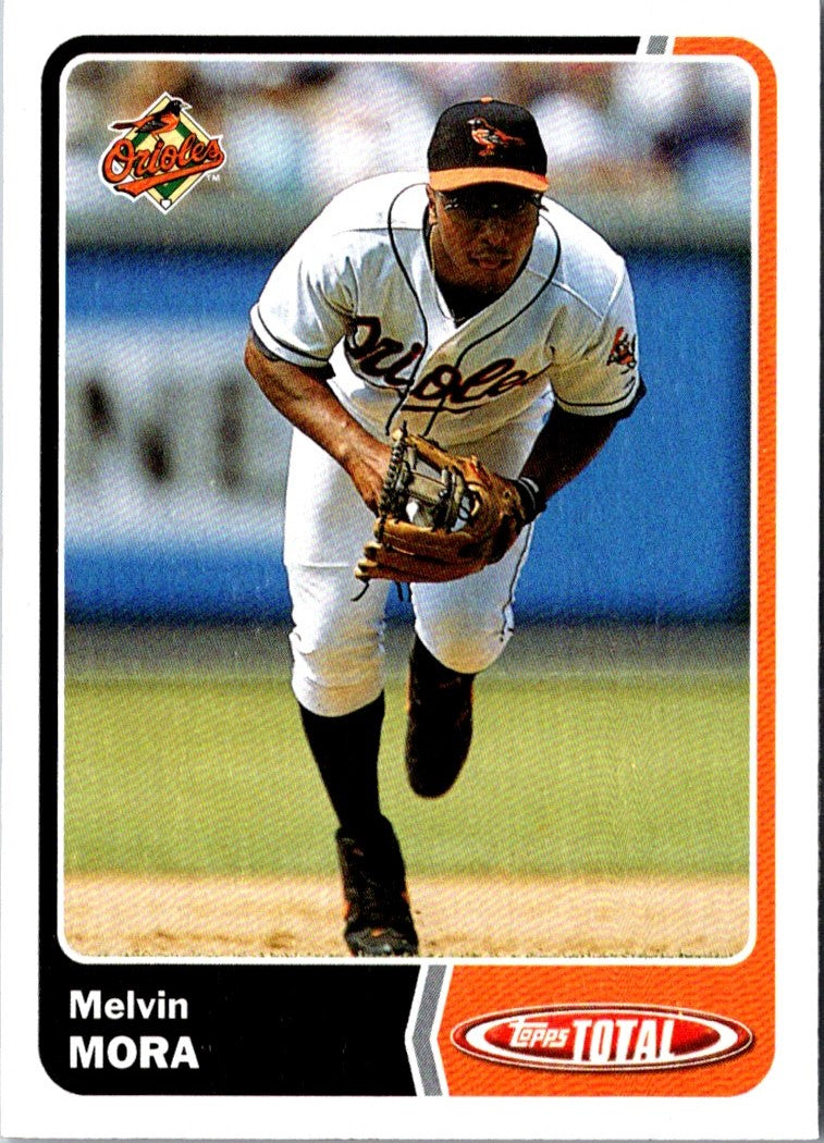 This 2003 Topps Total card of Melvin Mora is a must-have for any Orioles fan! Showcasing Mora in his classic Baltimore Orioles uniform, this card captures the excitement and energy of the 2003 season. It's the perfect addition to any Orioles fan's collection, and a great way to commemorate Mora's career. Get your hands on this card and show your Orioles pride!