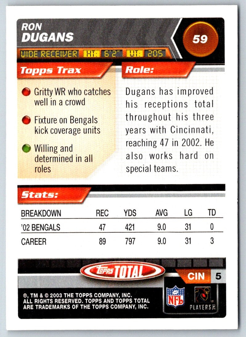 This 2003 Topps Total Ron Dugans card from the Cincinnati Bengals is a great addition to any sports fan's collection. The card features a full-color image of Ron Dugans in his Bengals uniform and displays his statistics and team logo on the back. A must-have for any Bengals fan, this card is sure to be a hit in any collection.