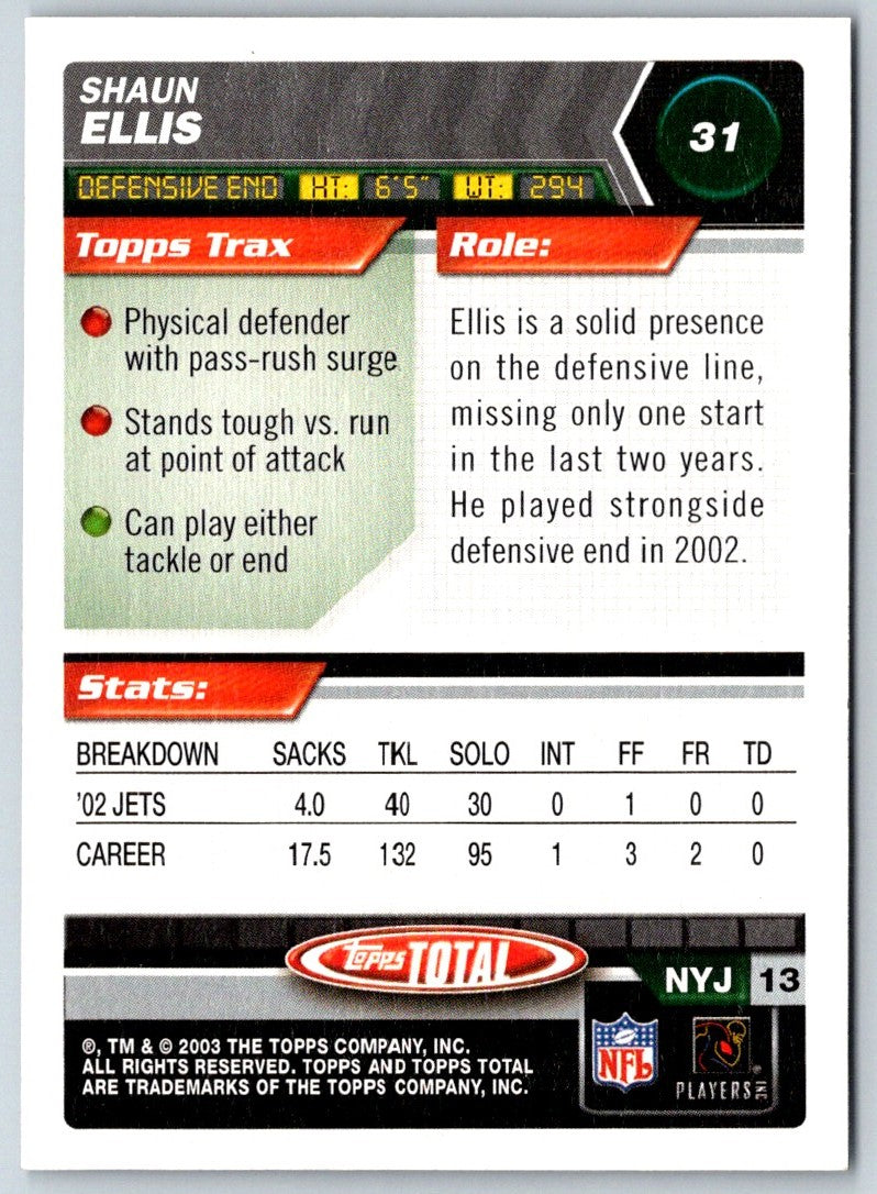 This 2003 Topps Total Shaun Ellis #31 card is a must-have for any New York Jets fan! The card features a sharp, colorful photo of Ellis in action, and offers a detailed statistical breakdown of his past season. This card is the perfect way to commemorate his 2003 season and honor his legacy as one of the greatest players in Jets history! Get your hands on this classic card today!