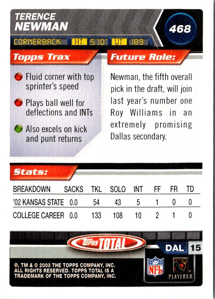 This 2003 Topps Total Terence Newman #468 Dallas Cowboys card is the perfect addition to any Cowboys fan's collection. Featuring an action shot of Newman on the field, this card celebrates his 8th season with the Cowboys. The card is in mint condition and features a vibrant, full-color design on sturdy card stock. Celebrate the career of this Cowboys great with this card!