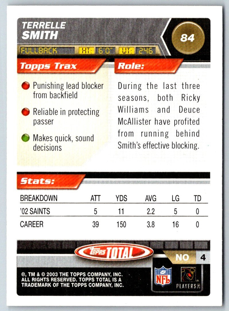 This 2003 Topps Total Terrelle Smith #84 New Orleans Saints card is a must-have for any NFL fan. It features a high-quality picture of Terrelle Smith in a Saints uniform, along with all his key stats and a brief bio. It's the perfect way to show your appreciation for Smith and the Saints. Add this card to your collection today and show your Saints pride!