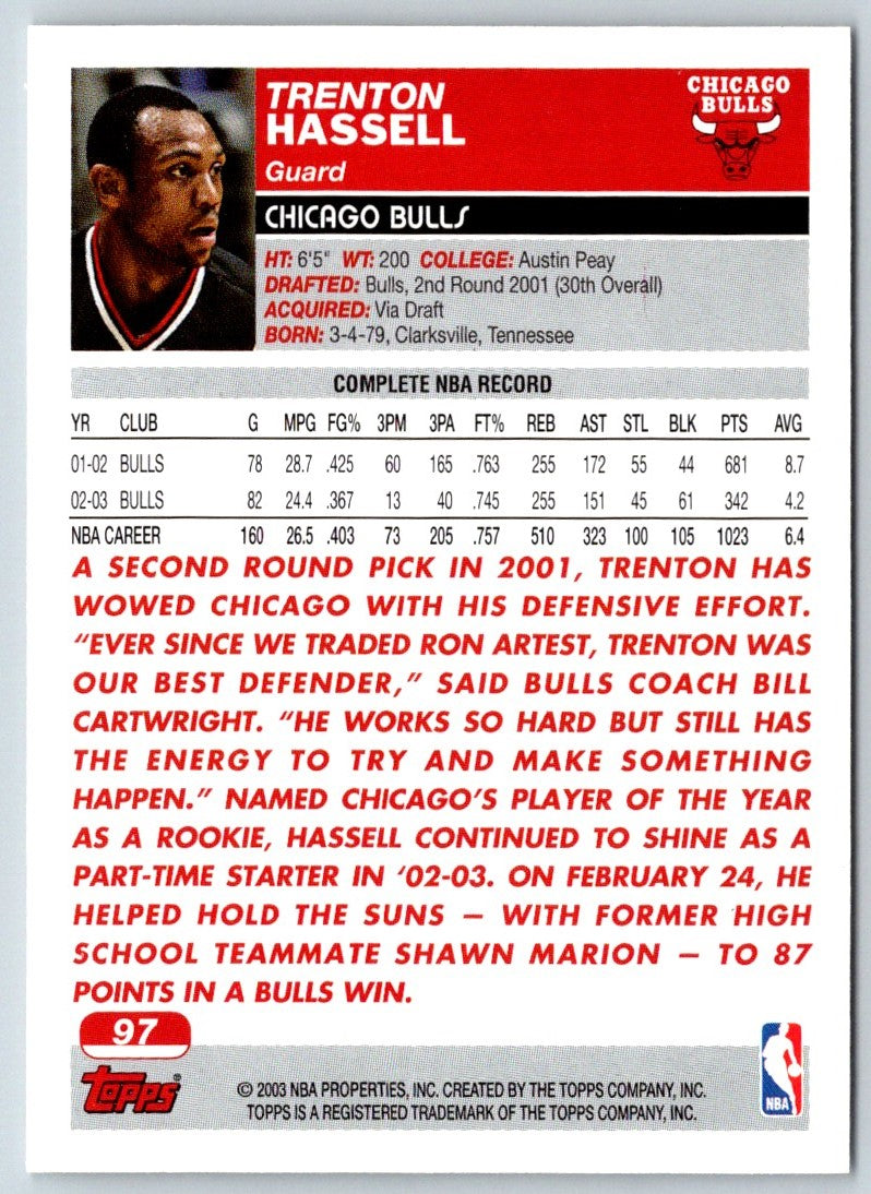 This 2003 Topps Trenton Hassell #97 card is a must-have for any Chicago Bulls fan. The card features a sharp image of Hassell in his Bulls uniform, captured in glorious full-color detail. The card also has a brief biography and career stats on the back, making it a great addition to any fan's collection. Get your hands on this card today and show your support for the Chicago Bulls!