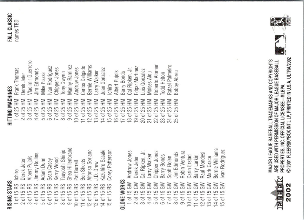 This 2003 Ultra Checklists Checklist MLB Checklist 1-186 is perfect for any baseball fan! This checklist contains 186 of the most popular cards from the 2003 MLB season, with no autograph, limited edition, or rare cards included. This is a great way to find the perfect card for your collection or to give as a gift to a baseball fan! With 186 cards to choose from, you're sure to find something special. Get your 2003 Ultra Checklists Checklist MLB Checklist 1-186 today!