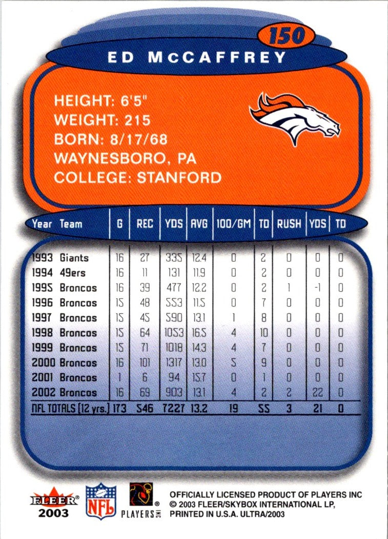 This 2003 Ultra Ed McCaffrey #150 Denver Broncos card is a must-have for any serious collector or fan. Featuring one of the most iconic players in the storied history of the Denver Broncos, this card is a stunning piece of memorabilia that will look great in any collection. The card features a beautiful full-color image of Ed McCaffrey in a classic Broncos uniform, as well as detailed stats from his time with the Broncos. The card also has a glossy finish, giving it a unique look and feel. Whether you’re a die-hard Broncos fan or just looking for a conversation starter for your collection, this card is a great choice.
