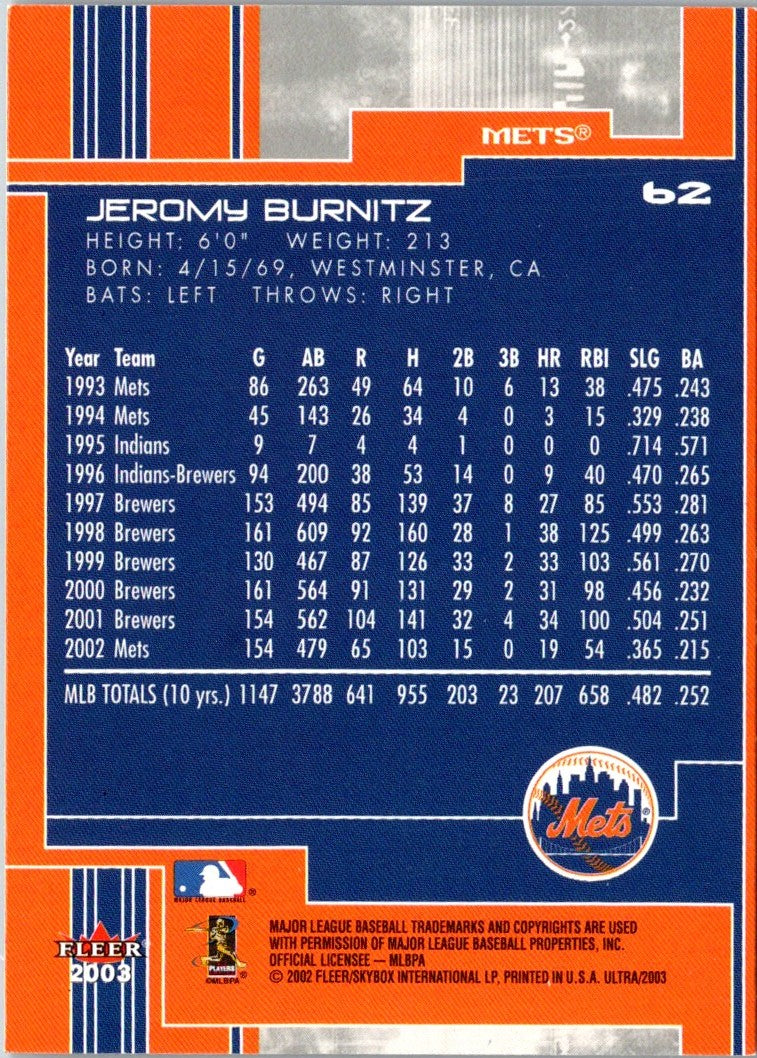Description: 2003 Ultra Gold Medallion Jeromy Burnitz #62