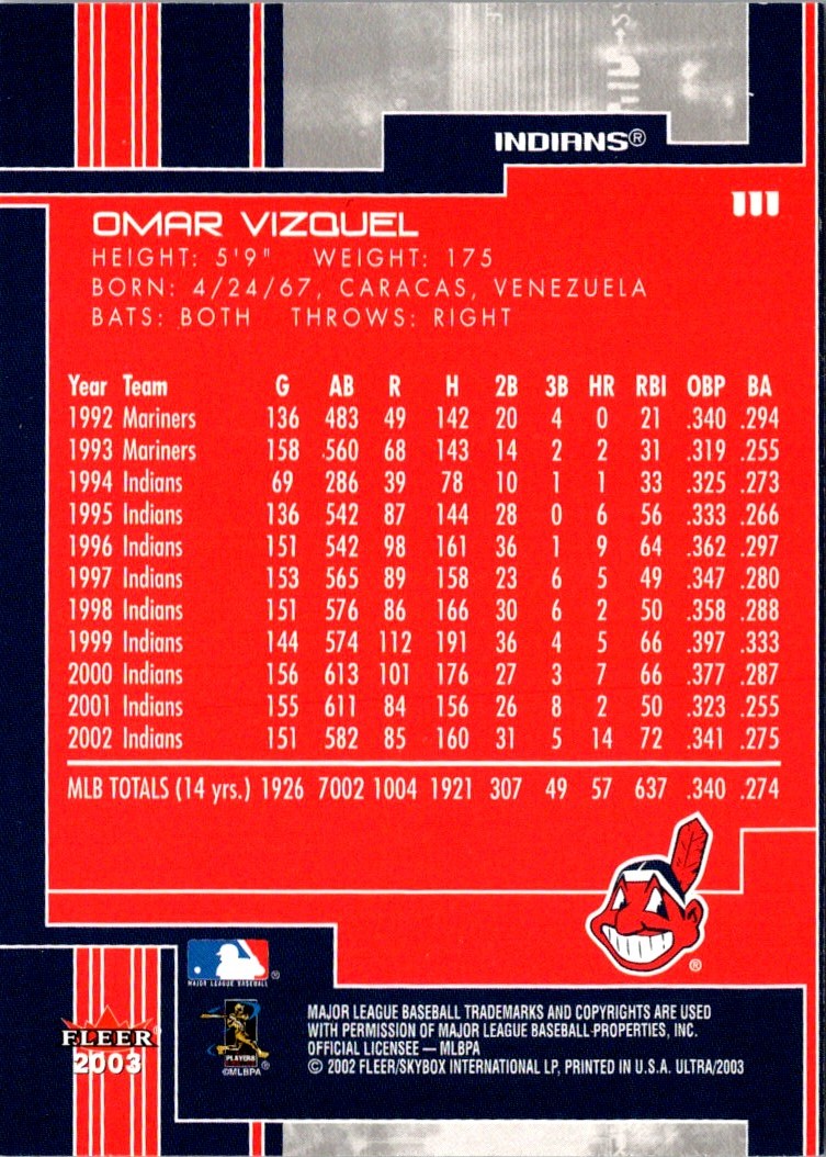 This 2003 Ultra Omar Vizquel card from the Cleveland Indians is a must-have for any baseball collector. It features a photo of Vizquel in his Indians uniform and jersey, along with his biographical information. It's a great way to commemorate Vizquel's remarkable career with the Indians. This card would be an excellent addition to any collection!