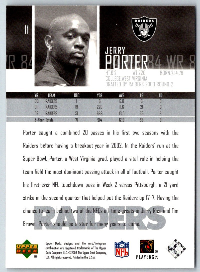 This 2003 Upper Deck Jerry Porter #11 Oakland Raiders card is the perfect addition to any sports fan's collection. This card features a crisp, clear image of Jerry Porter in his Raiders uniform, set against a bold blue background. The card also features Porter's stats and career highlights, as well as a brief bio. This card is a great keepsake of one of the most dynamic players in Raiders history. Add it to your collection today!