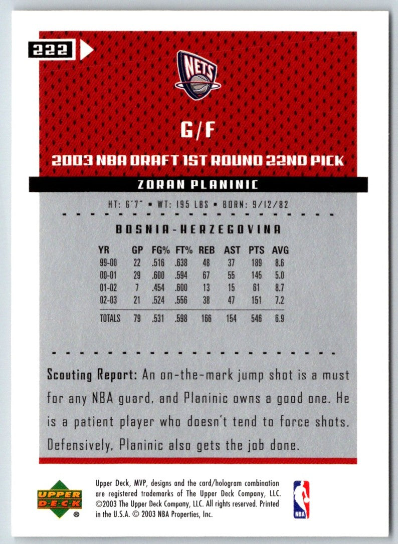 2003 Upper Deck MVP Zoran Planinic #222