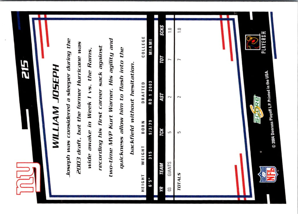This 2004 Score William Joseph card is a must-have for any New York Giants fan! This card features a full-color glossy photo of Joseph in his Giants jersey, perfect for any collector or fan. He was drafted by the Giants in the first round of the 2003 NFL Draft and went on to play eight seasons for the team, earning several accolades along the way. This card is a great way to celebrate the career of one of the Giants' most beloved players. Add this card to your collection today and show your Giants pride!