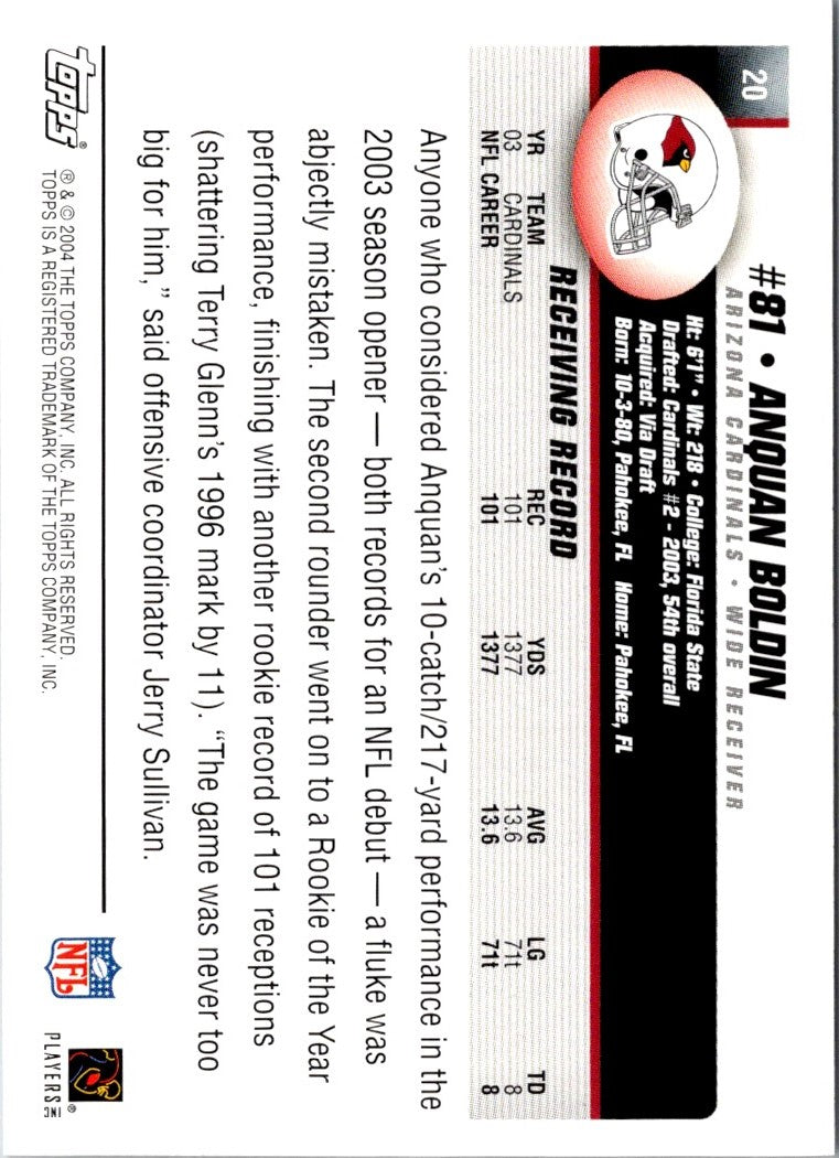 This 2004 Topps Anquan Boldin #20 Arizona Cardinals card is a must-have for any fan of the game! This card features Boldin in his iconic Cardinals jersey and is a great way to commemorate his career. Boldin was a standout wide receiver for the Cardinals and this card is a great way to honor his accomplishments. Add this card to your collection today and show your support for one of the greatest players in the game!