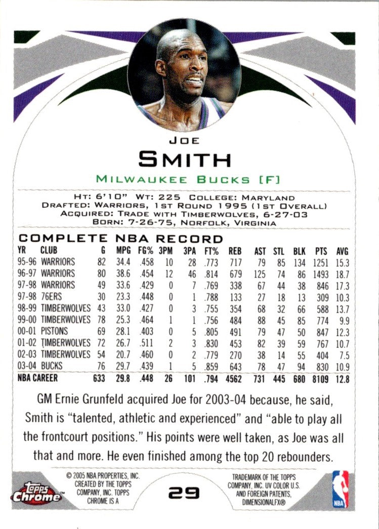 This 2004 Topps Chrome Joe Smith #29 card is a must-have for any Milwaukee Bucks fan! Featuring the Bucks star in full uniform, this card is sure to be a great addition to any collection. It is printed on premium chrome stock, making it perfect for display or framing. With sharp edges and bold colors, this card is sure to stand out in any collection. Add this 2004 Topps Chrome Joe Smith #29 card to your Milwaukee Bucks collection today!