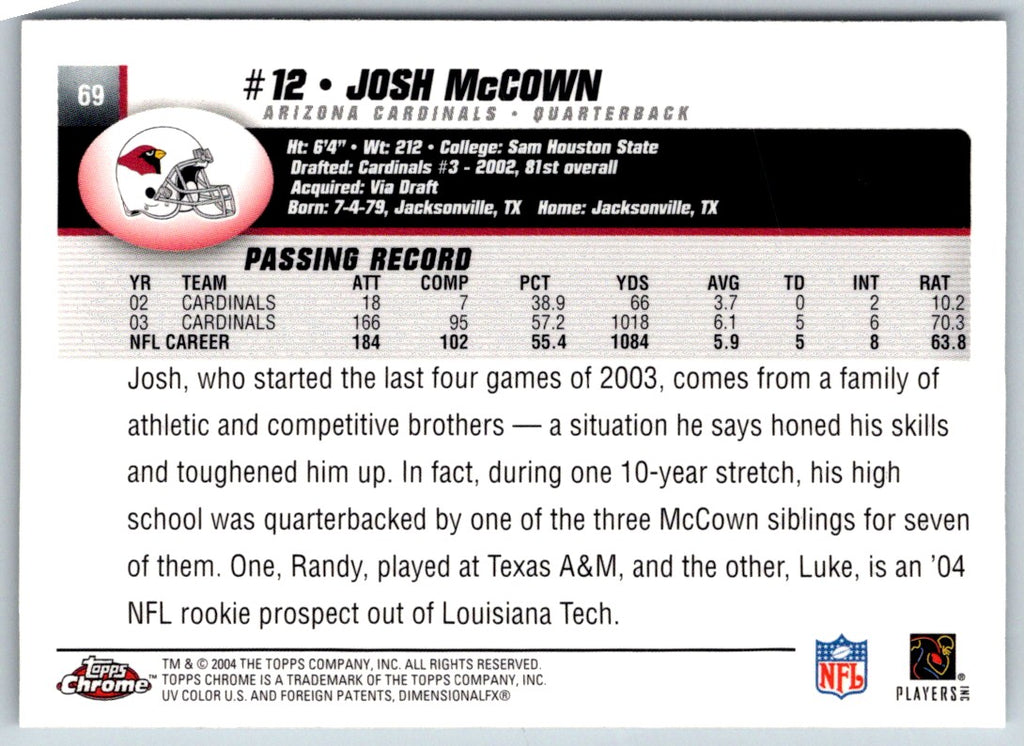 This 2004 Topps Chrome Josh McCown card #69 of the Arizona Cardinals is a must-have for any fan. It features a crisp, glossy finish and the vibrant colors of the Cardinals' uniform. The detail in the design of this card is truly impressive. It's sure to be a standout in any collection. With its classic style, it's sure to be a timeless piece for any collector. Pick up this card for a great addition to any collection.