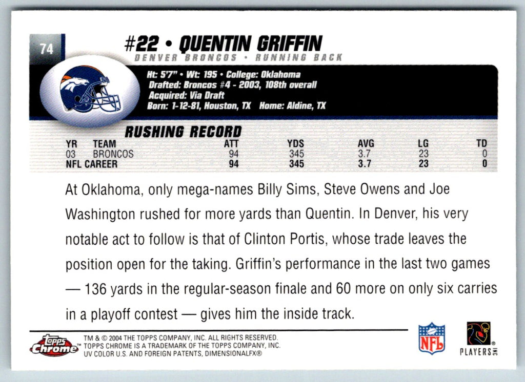 This 2004 Topps Chrome Quentin Griffin #74 Denver Broncos card features a glossy chrome finish and a high-quality image of the star running back in action. The card also features a detailed statistics section at the bottom and is sure to be a great addition to any fan's collection. It is the perfect way to commemorate an unforgettable season for the Denver Broncos. Add this card to your collection today and show your support for Quentin Griffin and the Denver Broncos.