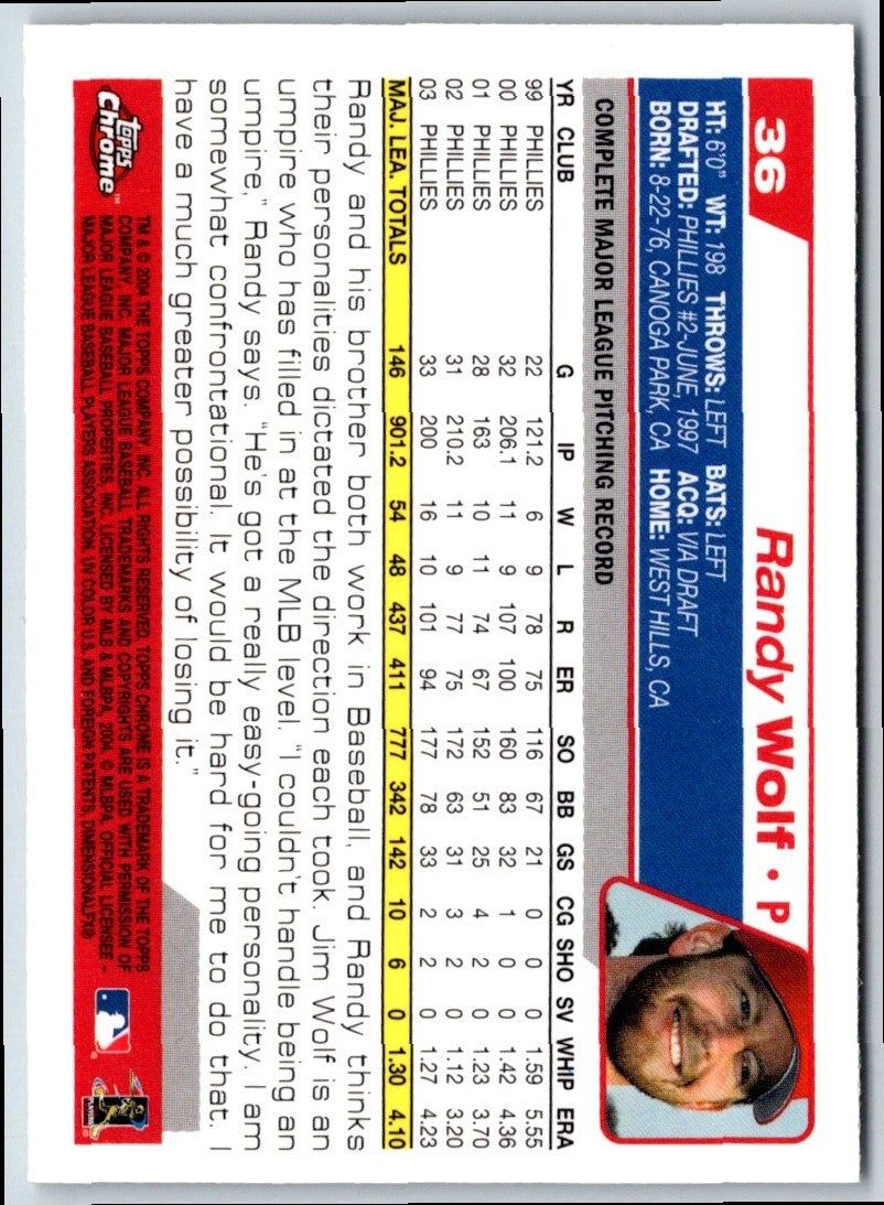 This 2004 Topps Chrome Randy Wolf card is a must-have for any Phillies fan! The card features a vibrant photo of Wolf in his full Phillies uniform, ready to take the mound. The card is printed on glossy chrome stock, giving it a unique look and feel. The back of the card showcases Wolf's impressive stats and career accomplishments. Add this card to your Phillies collection today and show off your love for the team!