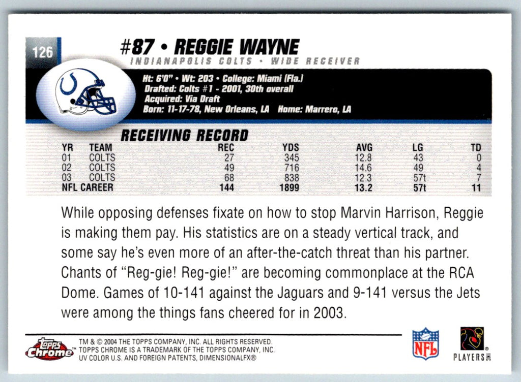 This 2004 Topps Chrome Reggie Wayne #126 card from the Indianapolis Colts is a must-have for any serious football card collector. Featuring a glossy finish and full-color action shot of Wayne in the midst of a pass reception, the card is sure to make a great addition to any collection. Wayne was a star wide receiver for the Colts for 14 years and was a key component in their Super Bowl XLI championship. With a card like this, you can show off your Colts pride and honor one of the most versatile and reliable receivers in the game. Don't miss your chance to add this card to your collection today!