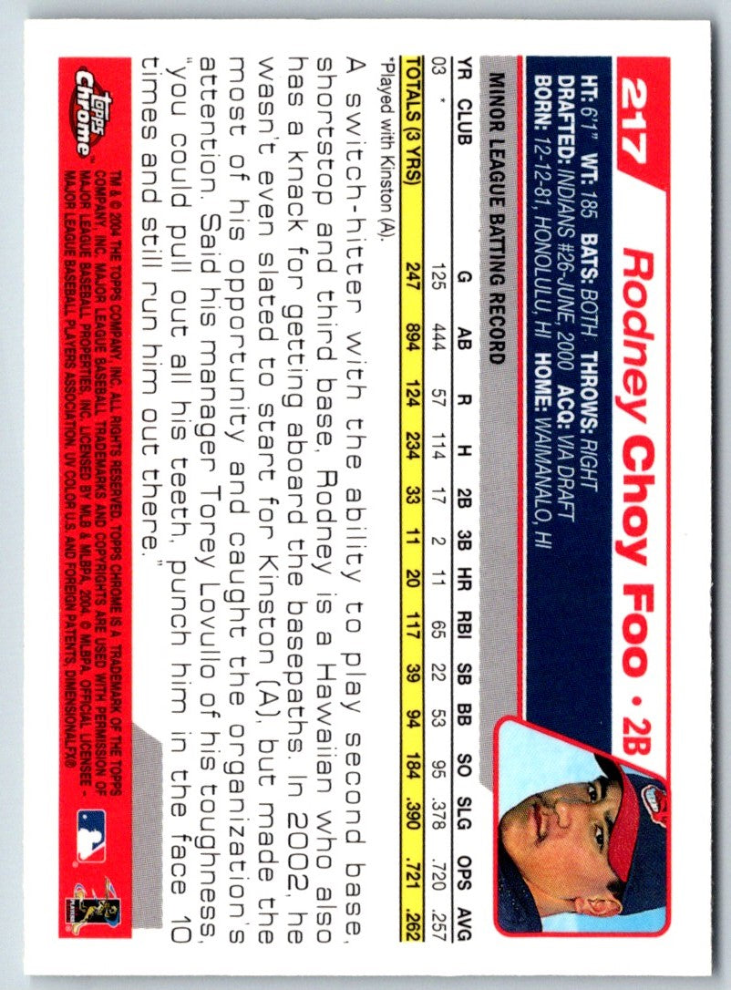 This 2004 Topps Chrome Rodney Choy Foo card features the Cleveland Indians infielder in action. The card is perfect for any collector of the Indians or Topps Chrome cards. It has a stunning design, with a brilliant chrome finish and a glossy sheen. The card also features vibrant colors that bring the image to life. The card is sure to be a great addition to any collection.