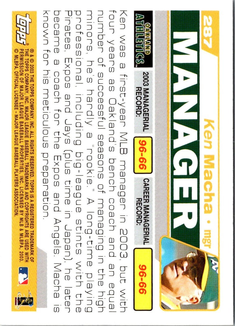 Introducing 2004 Topps Ken Macha #287 Oakland Athletics, the perfect addition for any baseball card collector! As the manager of the Athletics, Macha made his mark in the team's history. This card features Macha in a classic batting stance, ready to hit a home run! With a glossy finish and a vibrant color palette, this card is sure to stand out in any collection. Add this card to your collection today and commemorate Macha's time with the Athletics!
