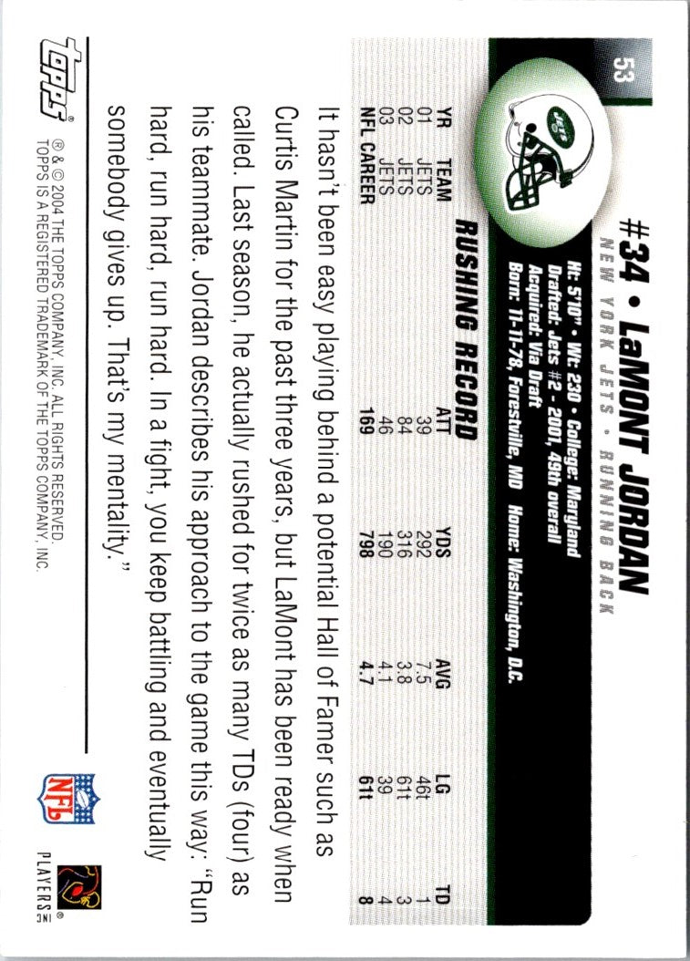 This 2004 Topps LaMont Jordan #53 New York Jets card is a must-have for any collector of Jets memorabilia. Featuring a glossy, full-color image of Jordan in his Jets uniform, this collectible card is sure to bring any fan’s collection to life. Whether you’re looking for a unique gift for your favorite fan or a special item to add to your own collection, you won’t want to miss out on this piece of Jets history. Add it to your collection today!