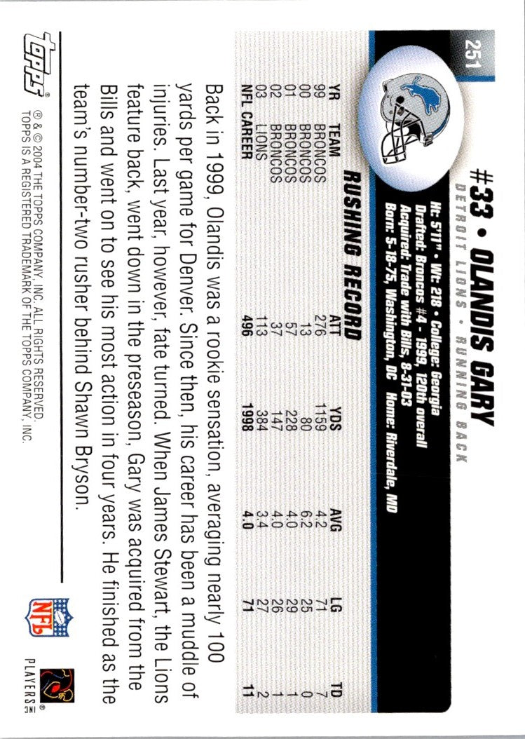 This 2004 Topps Olandis Gary #251 Detroit Lions card features the American football running back in his classic Lions uniform. This card is a great addition to any fan's collection. It features a photo of the action on the field and contains all his vital stats, perfect for reliving the glory days. Get this card now while supplies last and show your support for the Detroit Lions!