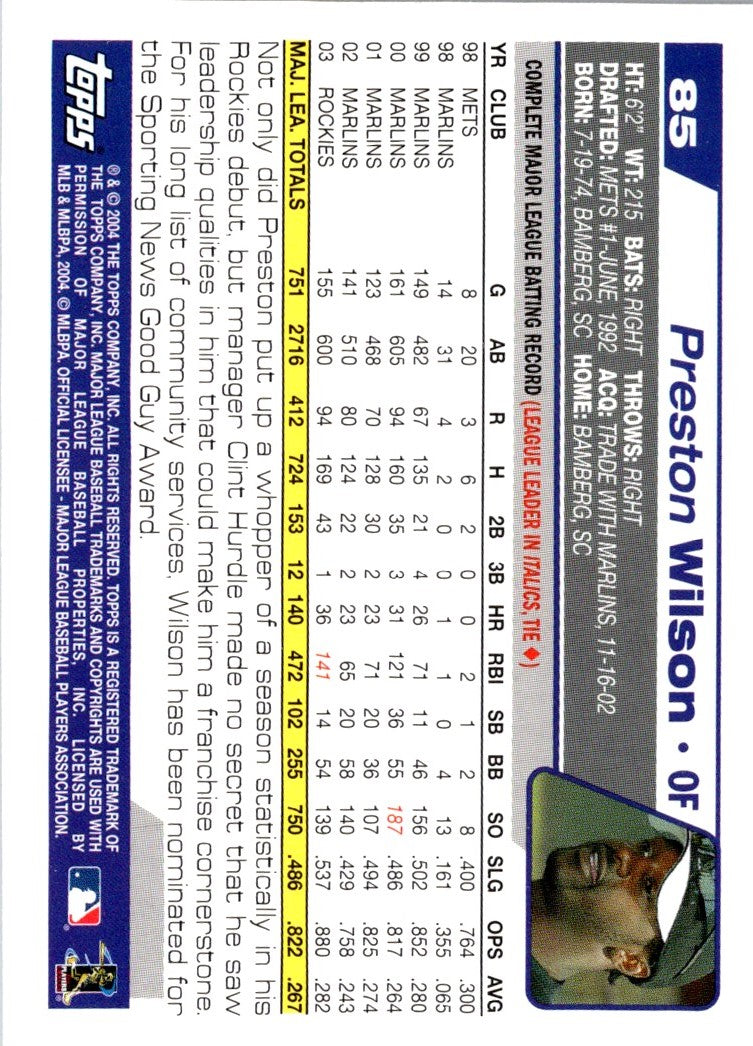 This 2004 Topps Opening Day card features Preston Wilson, outfielder for the Colorado Rockies. An integral part of the Rockies offensive attack, Wilson was a solid contributor to their lineup during his tenure in Colorado. This card shows Wilson in his classic batting stance, ready to smack the ball out of the park. Show off your team pride and add this card to your collection today!