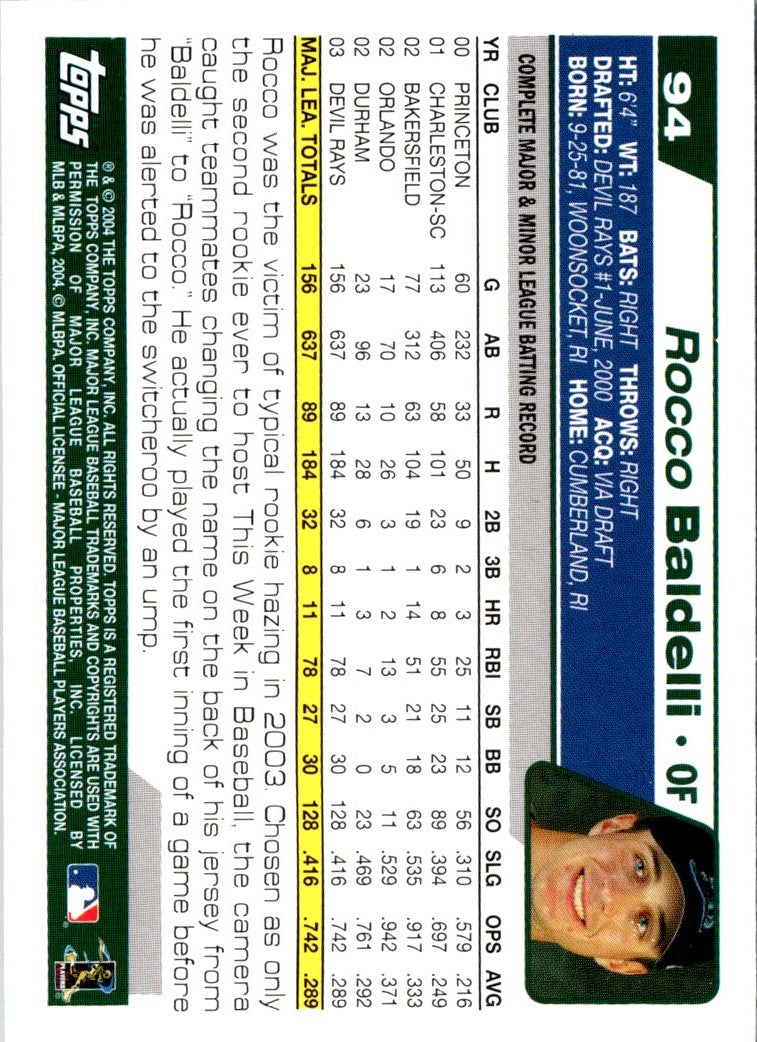 The 2004 Topps Opening Day Rocco Baldelli #94 Tampa Bay Devil Rays card is a must-have for any sports card collector. This card features an action shot of Baldelli stealing second base and is a great way to commemorate the start of the 2004 season. With bright colors and sharp corners, this card is sure to be a valuable addition to any collection. Don't miss out on your chance to own this piece of baseball history and add it to your personal collection today.