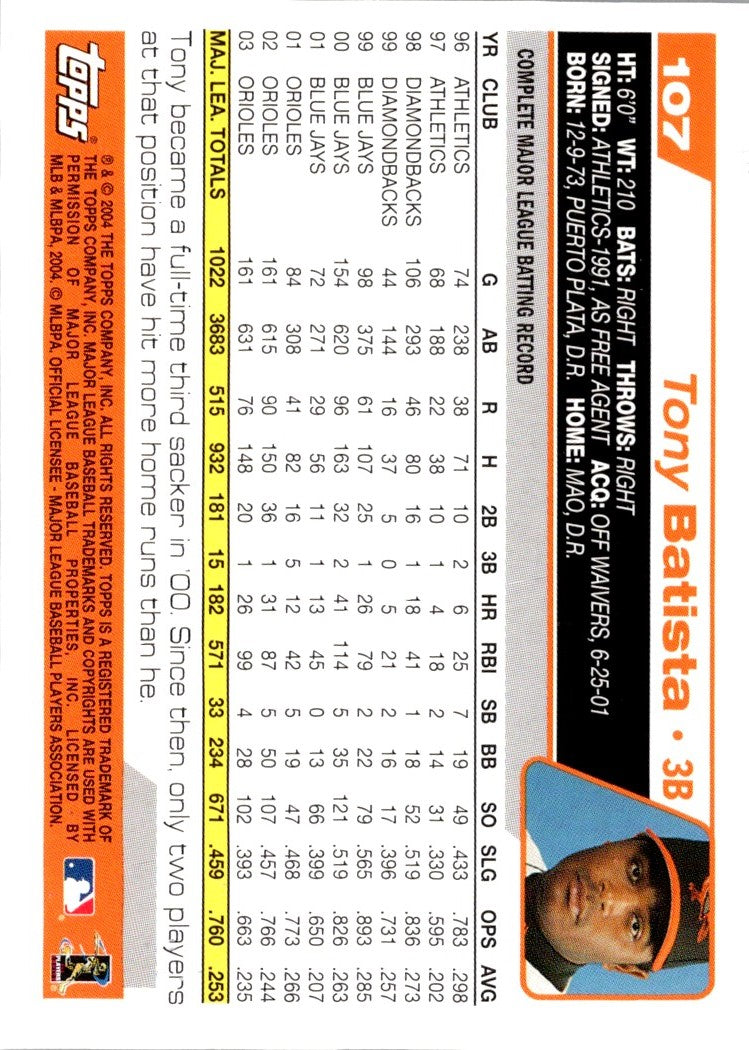 This 2004 Topps Opening Day Tony Batista card is a must-have for any Orioles fan! Featuring a glossy, full-color image of Batista in his Orioles uniform, this card is sure to stand out in any collection. Batista spent five seasons with the Orioles, and was a two-time All-Star selection during his time in Baltimore. This card is a great way to honor the career of one of the most beloved players in Orioles history. Add this card to your collection today and show off your Orioles pride!