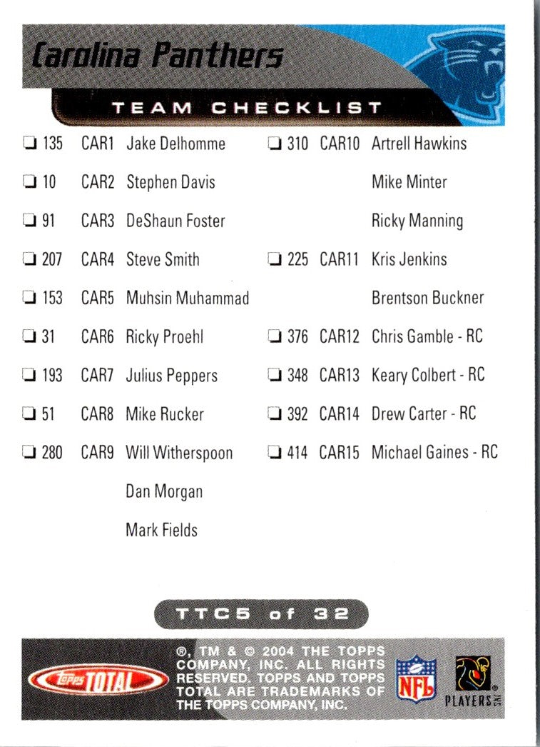 The 2004 Topps Total Jake Delhomme card #135 is a must-have for any Carolina Panthers fan! Show your support for one of the most beloved quarterbacks in franchise history with this iconic card. This card features an action shot of Delhomme in his Panthers uniform, with vivid colors and crisp lines that make for an impressive display piece. Whether you're a collector or just a fan, this card is a great way to show your love for the Panthers and Jake Delhomme!