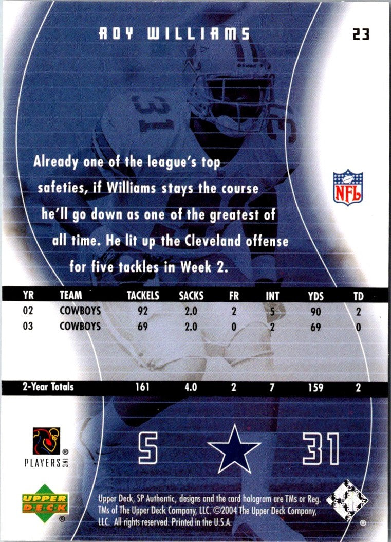 This 2004 UD Roy Williams #23 Dallas Cowboys card is an amazing piece for any Cowboys fan. Featuring a classic Cowboys design, the card is sure to be a great addition to any collection. It is in excellent condition and could easily be a centerpiece of any collection. With a sharp, detailed image of Roy Williams in a Cowboys jersey, this card is a great way to commemorate one of the greatest Dallas Cowboys players of all time. Add this card to your collection today and show your Cowboys pride.