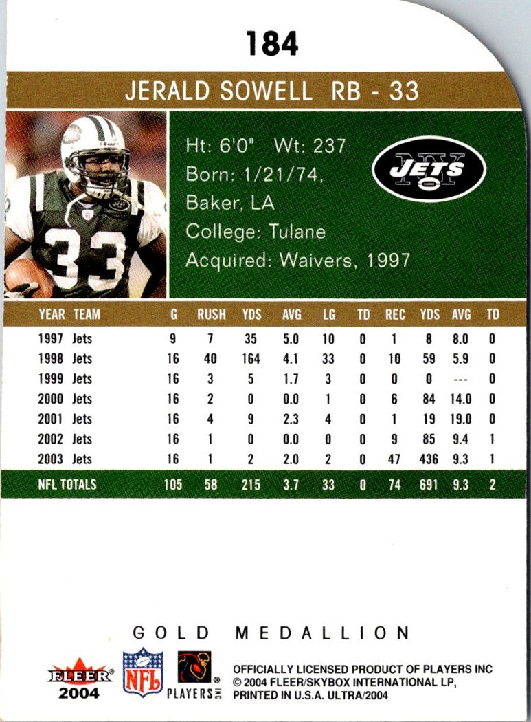 This 2004 Ultra Jerald Sowell #184 New York Jets card is a great addition to any collector's set. Featuring a glossy, full-colour image of Sowell in action on the field, this card is sure to stand out in any collection. The back of the card includes detailed statistics and career highlights of the star running back. A must-have for any Jets fan, this card is a timeless reminder of a legendary player's career. With its beautiful design and quality construction, this card is sure to be a treasured part of your collection for years to come.
