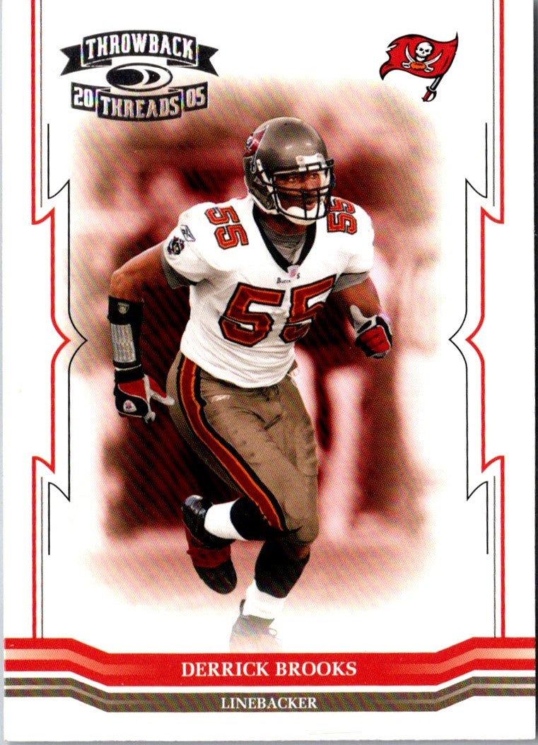 Derrick Brooks is one of the most decorated NFL players in history. This card celebrates his career with the Tampa Bay Buccaneers. Show your love for the team with this 2005 Donruss Throwback Threads card featuring the Hall of Fame linebacker. The card showcases a full-color image of Derrick Brooks in an iconic Buccaneers uniform. It’s the perfect collectible for any football fan. Get your hands on this card and add a piece of NFL history to your collection.