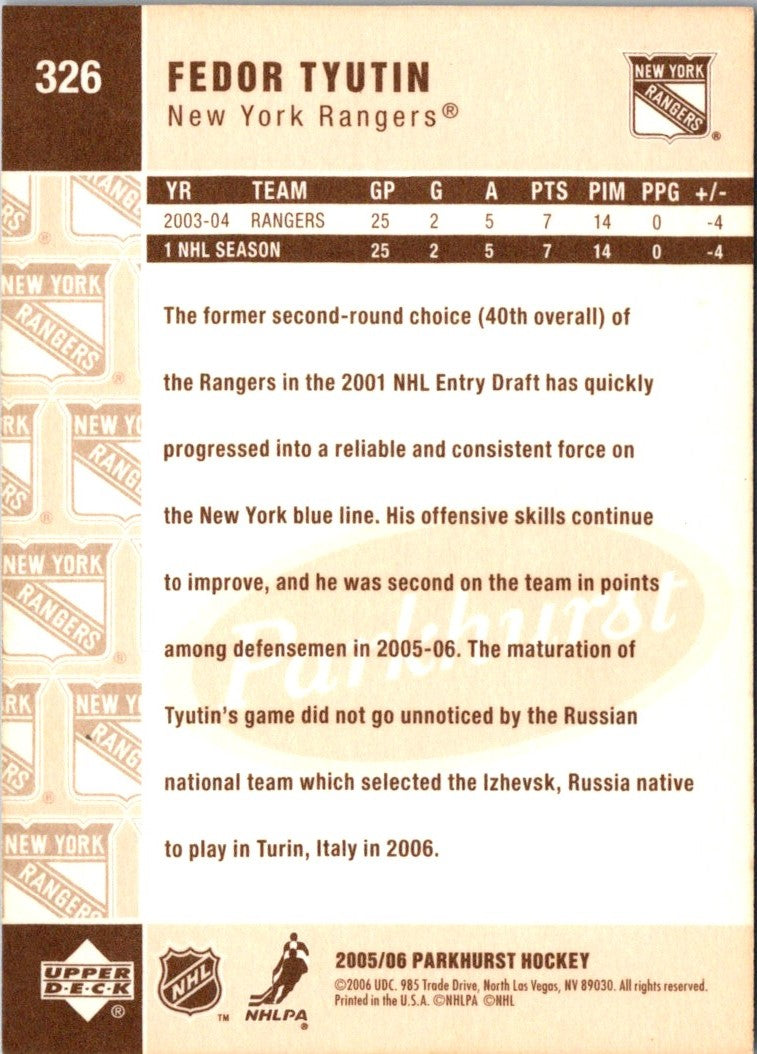 This 2005 Parkhurst Fedor Tyutin #326 New York Rangers card is a must-have for any die-hard hockey fan. Featuring a vibrant, full-color image of the legendary Rangers defenseman, this card celebrates his successful career with the team. Printed on high-quality card stock, it's a great way to show your support for the team. Perfect for any collection or display, this card is sure to make a great addition for any hockey fan.