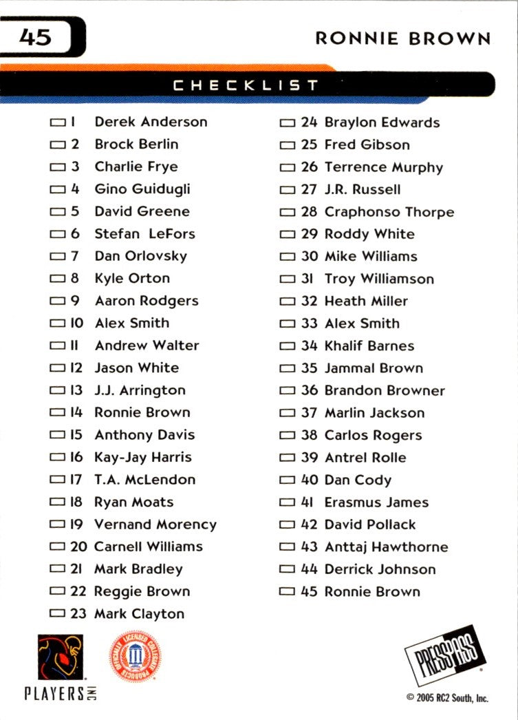 This 2005 Press Pass Ronnie Brown #45 Auburn Tigers card is a must-have item for all fans of college football. Featuring the Heisman Trophy finalist and NFL Pro Bowler, this card is a great way to commemorate this football star's impressive collegiate career. With a bright and vibrant design, this card is sure to stand out in any collection. Show your support for Ronnie Brown and the Auburn Tigers with this unique and collectible card. Add it to your collection today!