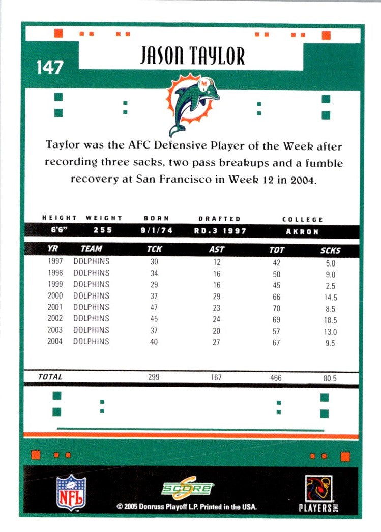 This is your chance to add a piece of NFL history to your collection! This 2005 Score Jason Taylor #147 Miami Dolphins card features a crisp action shot of the Hall of Fame defensive end in his home team's teal and orange. Show off your fandom of one of the NFL's greatest defensive players and the Miami Dolphins with this card. Add this card to your collection and never miss a chance to remember the career of a true all-time great!