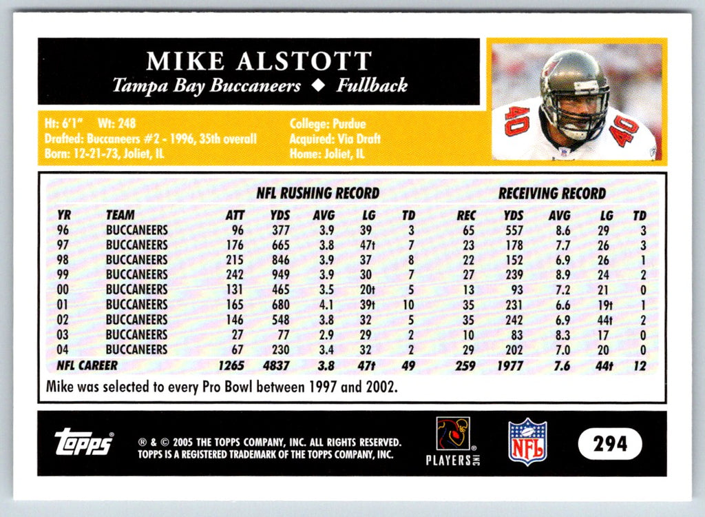 This 2005 Topps 1st Edition Mike Alstott #294 card commemorates the Tampa Bay Buccaneer's powerhouse fullback. The card features a detailed color photograph of Alstott in his Buccaneers uniform, and is printed on glossy, high-quality card stock. It's the perfect addition to any collector's Buccaneers or Alstott memorabilia. Own a piece of Buccaneers history today!