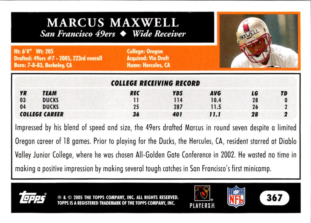 Celebrate the 50th anniversary of Topps with this Marcus Maxwell #367 rookie card from the 2005 set. Show your support for the San Francisco 49ers with this collectible card, featuring a photo of Maxwell taking the field. Perfect for any fan of the 49ers or Maxwell, this card is sure to become a cherished memento in your collection.