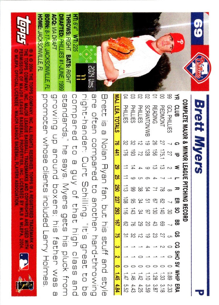 This 2005 Topps Brett Myers #69 Philadelphia Phillies card is a must-have for any Phillies fan's collection! Featuring Myers in full Phillies home uniform, this card celebrates his outstanding 2005 season, in which he was an All-Star and achieved career highs in wins, strikeouts, and ERA. The back of the card offers an in-depth statistical look into Myers' career year. Get your hands on this piece of Phillies history today!