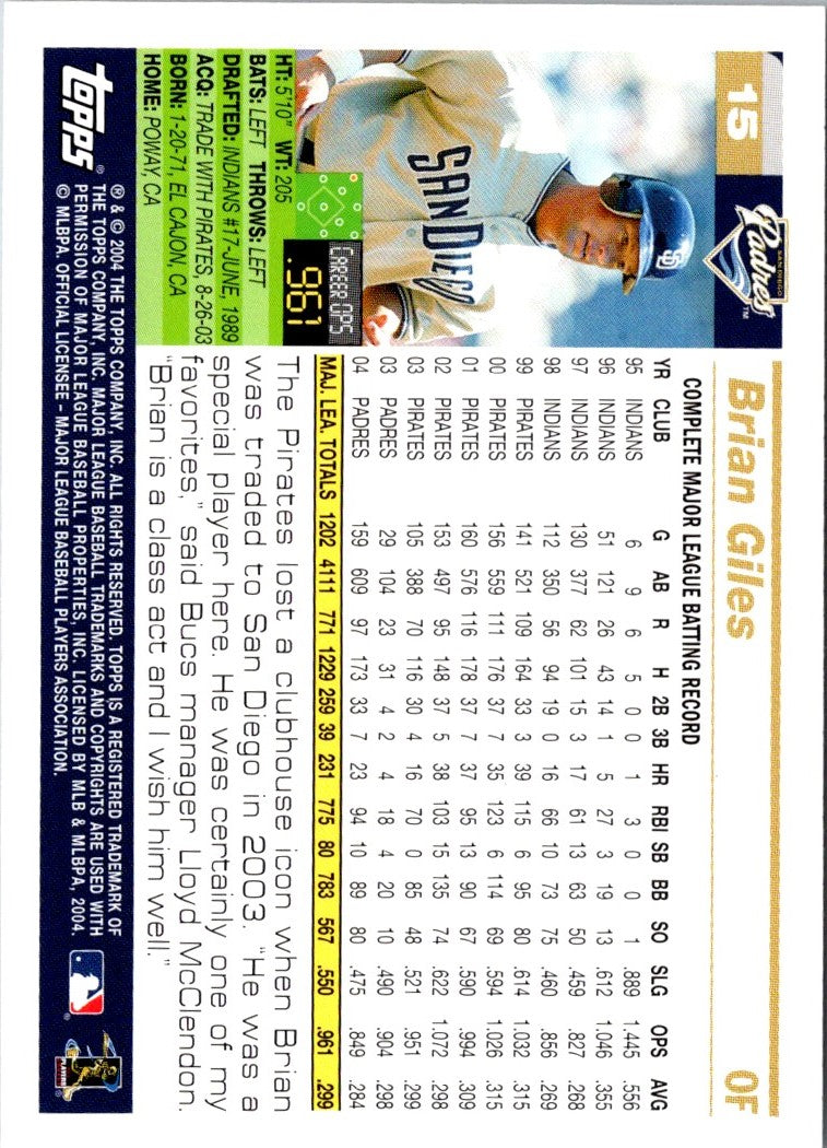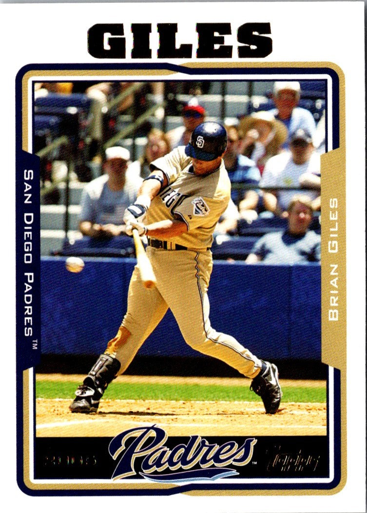 This 2005 Topps Brian Giles #15 San Diego Padres card is an essential addition to any collector's set. Showcasing a classic batting shot of Giles, this card is sure to be the centerpiece of your collection. The vivid colors and sharp corners make this card a must-have. This card is sure to be a hit with any fan of the Padres or of baseball in general. Add this card to your collection today and add value to your set!