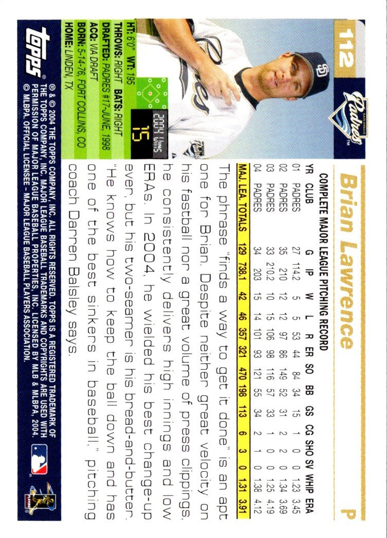 2005 Topps Brian Lawrence #112 San Diego Padres card is the perfect addition to any baseball fan's collection. Show off your team spirit with this card featuring Lawrence in his San Diego Padres uniform. This card is in great condition, with vibrant colors and excellent detail. It's a must-have for any fan of the Padres and is sure to become a treasured part of your collection. Add this card to your collection today and show your support for the San Diego Padres!